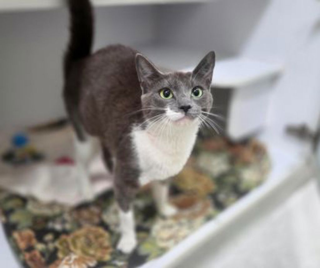 Viola is a bright, cheerful cat who greets life and people, with open paws! With her beautiful grey-and-white coat and expressive eyes, she's the first to walk up, say hello, and ask for pets.
