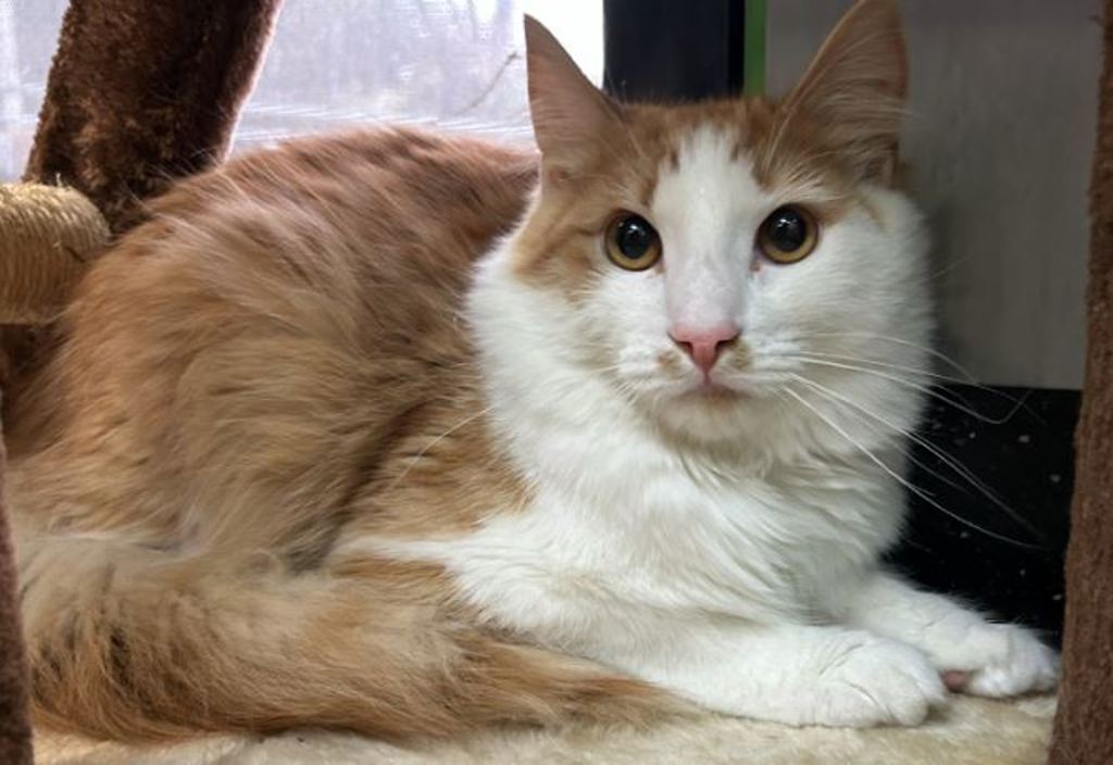 Fluffnut is an 8-month-old long-haired ginger and white kitten with a name as charming as his personality. Soft, floofy, and full of quiet confidence, Fluffnut is the kind of companion who makes a home feel warm just by being in it.