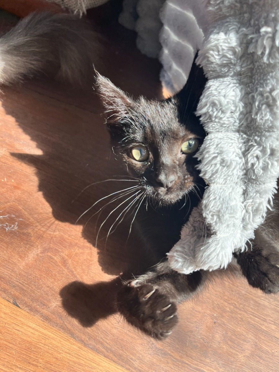 Meet Pancake, a charming female kitten who is currently taking a cautious approach to life. She is one of the quieter and shyer members of her litter, still gently coming out of her shell. Pancake is searching for a very patient, calm home where she can learn that human hands mean kindness, not just curiosity.