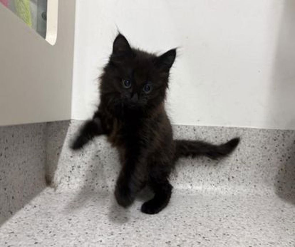 Hi there, I'm Squirt, a super fluffy little black kitten who basically looks like a tiny black hole of fuzz with eyes that pull you right in. I may be small, but I'm hard to miss-I'm the life of the party in my condo with all my feline friends, and I'm always the one keeping everyone laughing and on their toes. You never know what I'll do next, but it's always entertaining.