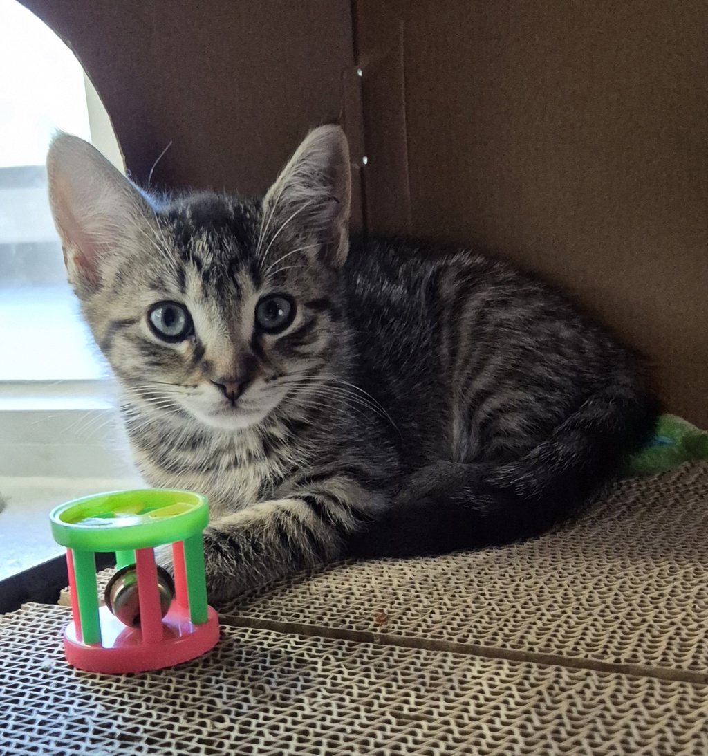 Since we're still young, our personalities are developing, and we'll thrive in a stable home. Please be patient with us as we adjust to our new environment. A safe room to get used to new sounds and smells would help, along with a scratching post, a comfy bed, soft toys, and rolling, bell toys (our favorites)!