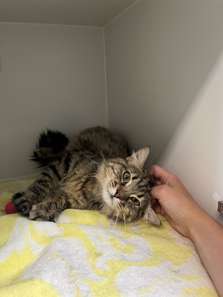Tuna is a young male medium-haired cat with a big personality tucked inside his fluffy coat. At first glance, he may come across as a little flighty-he'll pretend he wants to leap off the table like he's auditioning for a talent show-but really, he just wants to explore EVERYTHING. This boy loves to walk, jump, investigate, and chirp his way through the world!