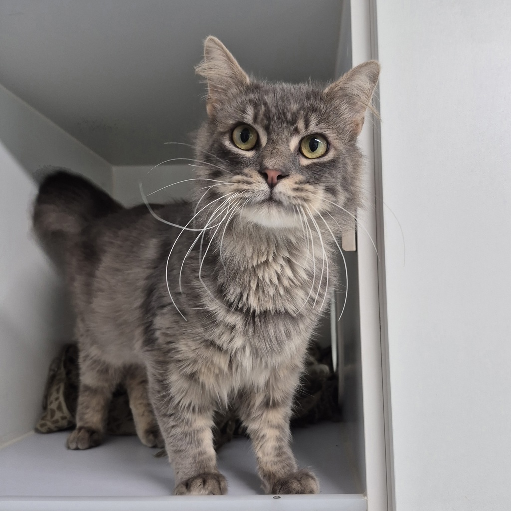 Deakin is a stunning medium-haired grey tabby with a heart every bit as soft as his coat. Though he may seem a little unsure when faced with something new, this handsome boy warms up fast-and once he does, say hello to Sir Purrs-a-Lot, ruler of affection and master of enthusiastic head-butts!