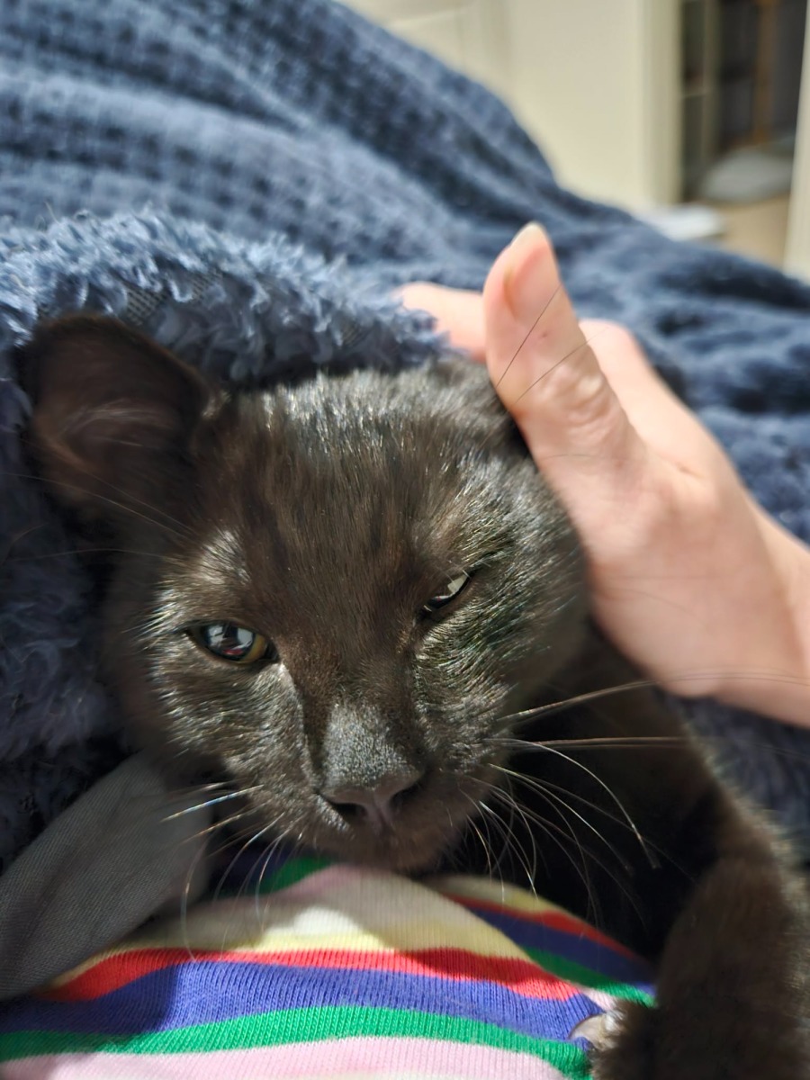 I am extremely affectionate once I feel safe. I purr the moment you touch me. I give smooches, rub my face on you constantly, and will roll over to offer my belly like it is my full time job. If you sit down, there is a very good chance I will be on you. I am snuggly in the best possible way.