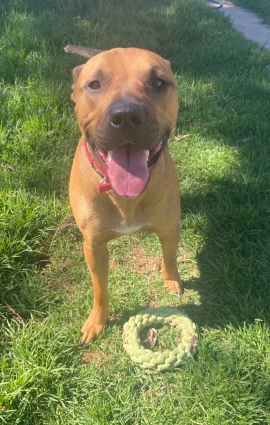 Freddie, 2yo Staffy x, is such a gentle sweetheart and a big softie who wouldn’t hurt a fly! Freddie’s physical prowess includes being able to jump high and enthusiastically. He doesn’t jump at people but tends to jump at doors and fences. His foster carers are working on this and the good news is that he doesn’t use this skill to escape the yard.