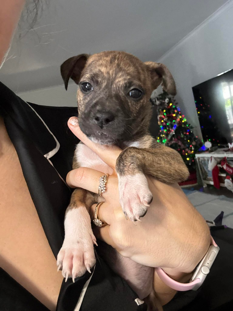 Olive is a small puppy with the sweetest little face and a gentle, loving spirit. Her beautiful brindle markings make her extra special, and her petite size only adds to her charm. Her size is not guaranteed to stay small, we don't know her breeding so she is a proper mystery mix!