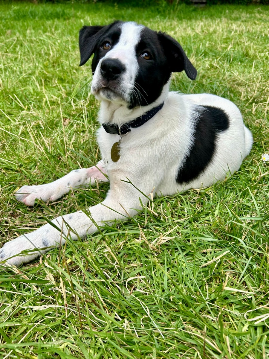 Van Halen is the kind of puppy who makes you smile the moment you meet her. With her two bold black eye patches and her soft, velvety coat, she looks like a little cartoon character come to life — expressive, sweet, and full of charm. She’s already showing that lovely blend of Border Collie intelligence and Staffy affection, but she carries it with a softness that makes her incredibly endearing.
