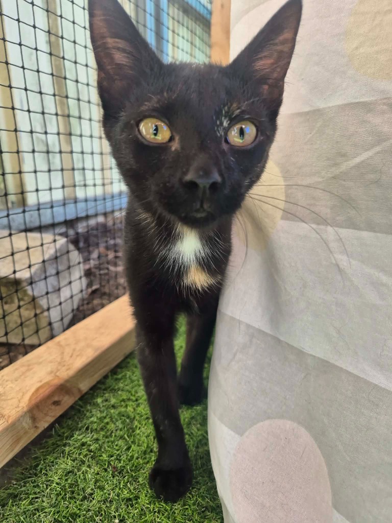 Cinder is a shy, nervous kitten who is still adjusting to life in care and learning that people can be trusted. She will thrive in a quiet, calm home with children over 12 who can respect her boundaries. Cinder is cat friendly and would do best in a home with another friendly cat, or adopted together with one of her sisters for comfort and companionship.