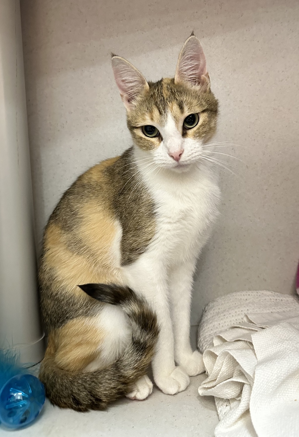 Almond is a beautiful calico-coloured girl with a gentle, loving nature. She's ready to find a safe, caring home where she can truly relax and feel part of the family.