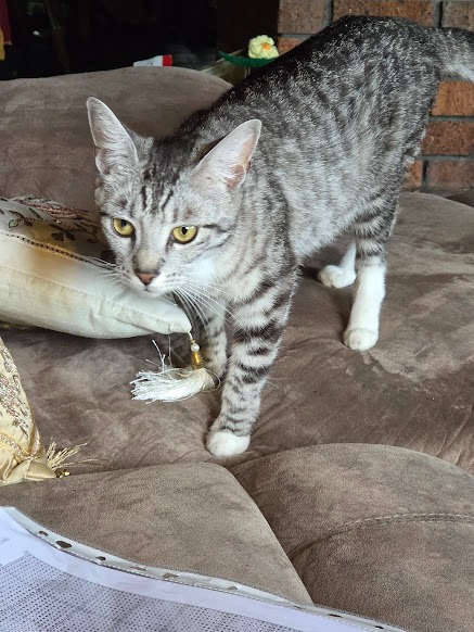 Cass is incredibly friendly and very chatty, always keen to tell you about her day or welcome you into the room. She has a stunning silver tabby coat paired with arresting golden eyes that are impossible to forget. Affectionate by nature, Cass absolutely adores attention and will happily soak up every pat, cuddle, and kind word she can get.