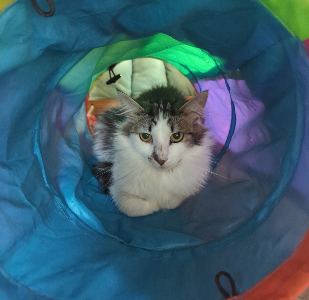 Crispian is a beautiful medium-haired cat with a shy nature and the gentlest of manners. He's quite timid and unsure at first, but beneath that tension is a kind boy who is slowly learning that human hands can bring comfort and love.