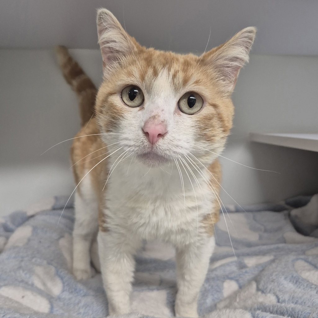 This sweet boy is understandably a little timid, but he shows lovely signs of trust. He allows handling easily and responds positively to gentle chin scratches and rump pats-he'll even lift his tail for a bum scratch once he's feeling comfortable.