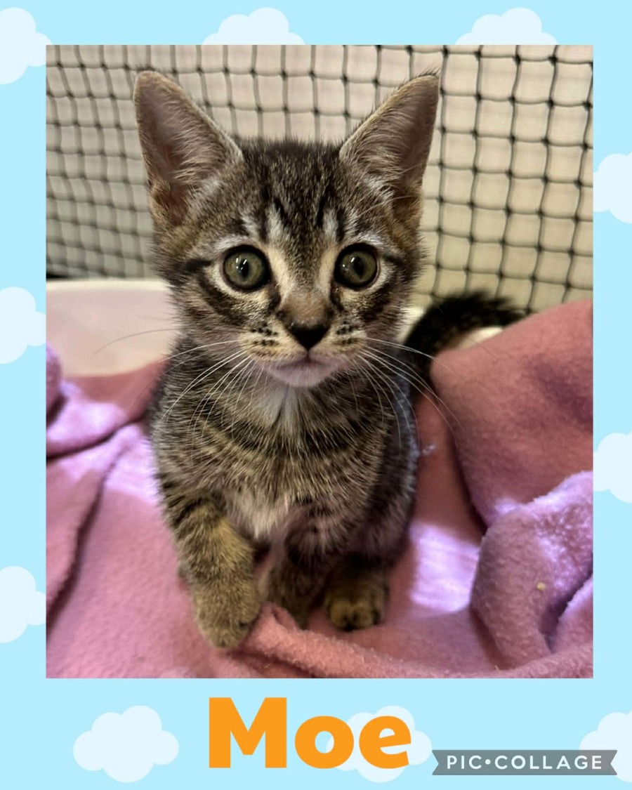 If you're seeking a cuddly friend to share your days with, Moe is an ideal choice. He will thrive in a loving home where he can continue to explore and play to his heart's content. He's the purr-fect match for anyone looking to add a touch of silliness and warmth to their life. Ready to let this tabby kitten win your heart? Moe is waiting for the right family to shower him with love and attention.