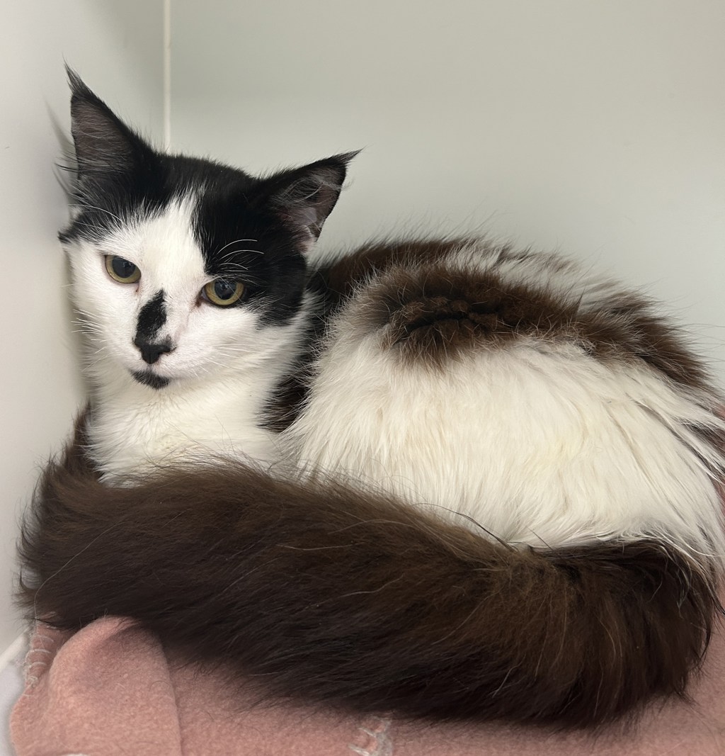 Sheldon is a gorgeous 1-year-old white and black domestic medium hair with a sleek, slender frame and a striking splash of black on his nose and chin - he's impossible not to notice! But his beauty is just the beginning.