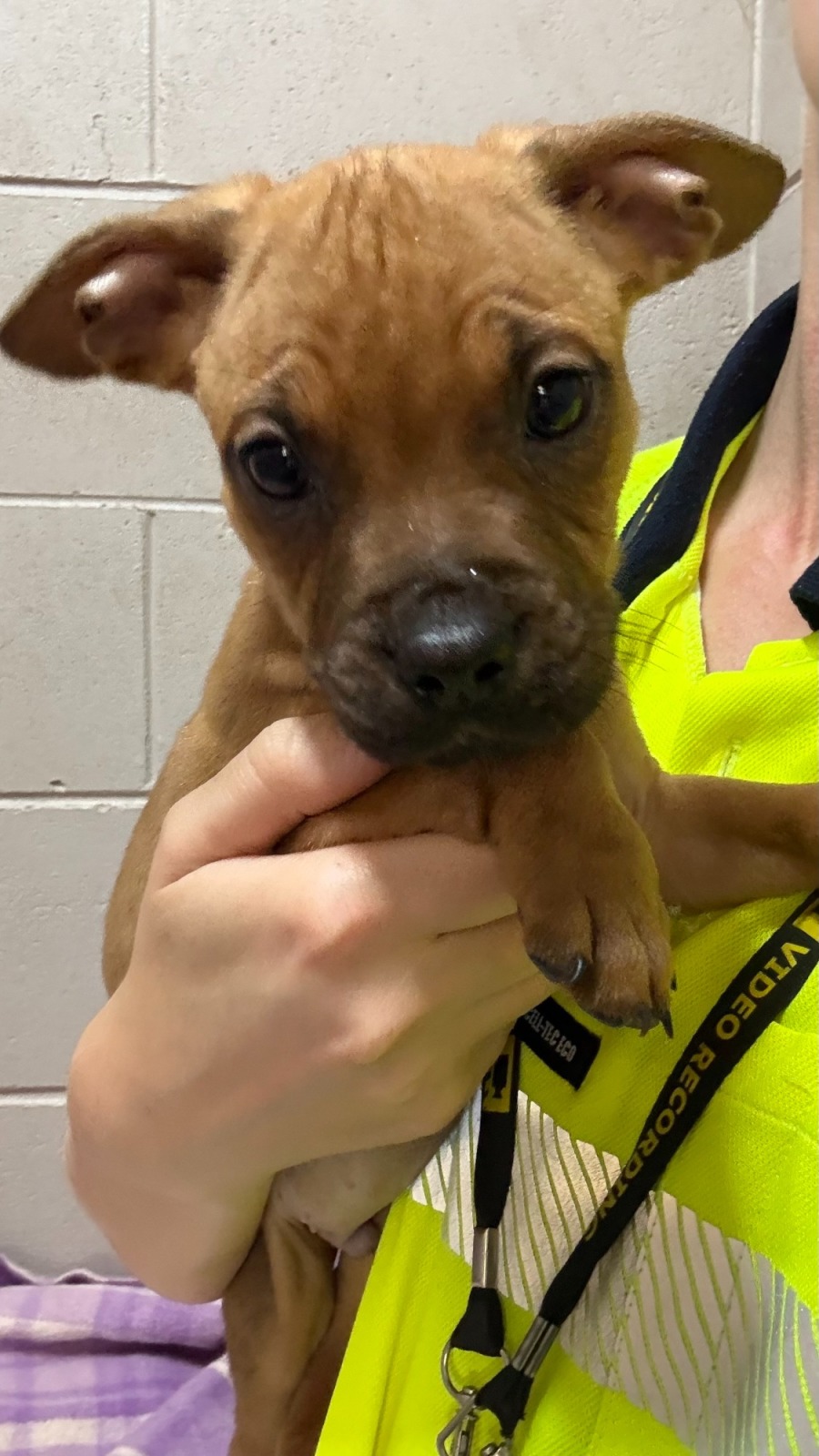 Hershey Kisses is a Staffy mix; due to his tender age, the blend of breeds within him is somewhat of a delightful mystery. Some speculate that he could have Boxer or Cattle Dog in him, which hints at a future filled with character and charm. Stepping into a life of discovery, he is eager to explore the world around him, guided by his strong motivation for food and treats.