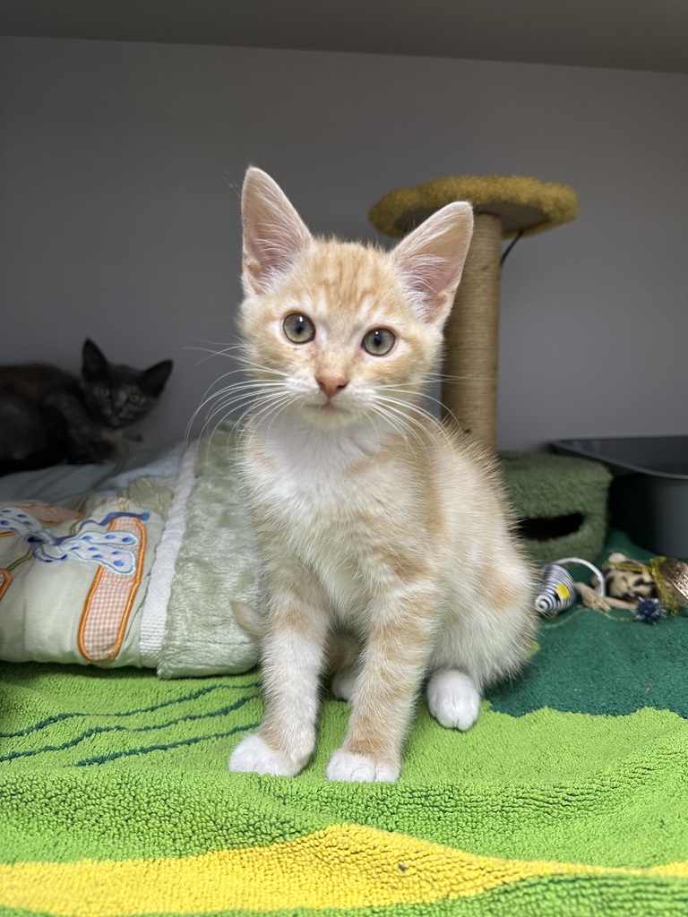 Meet Pizza, a charming 3-month-old ginger tabby boy with striking light green eyes. This adorable domestic short-haired kitten has a unique, eye-catching appearance that makes him truly special. Pizza arrived at our shelter with his sibling, but now he's ready to find his forever home. Bright, playful, and affectionate, he loves exploring and cuddling. Pizza is looking for a loving family where he can thrive and grow. If you're searching for a sweet, vibrant kitten to bring joy and warmth into your life, Pizza is the perfect match. Come and meet him soon!