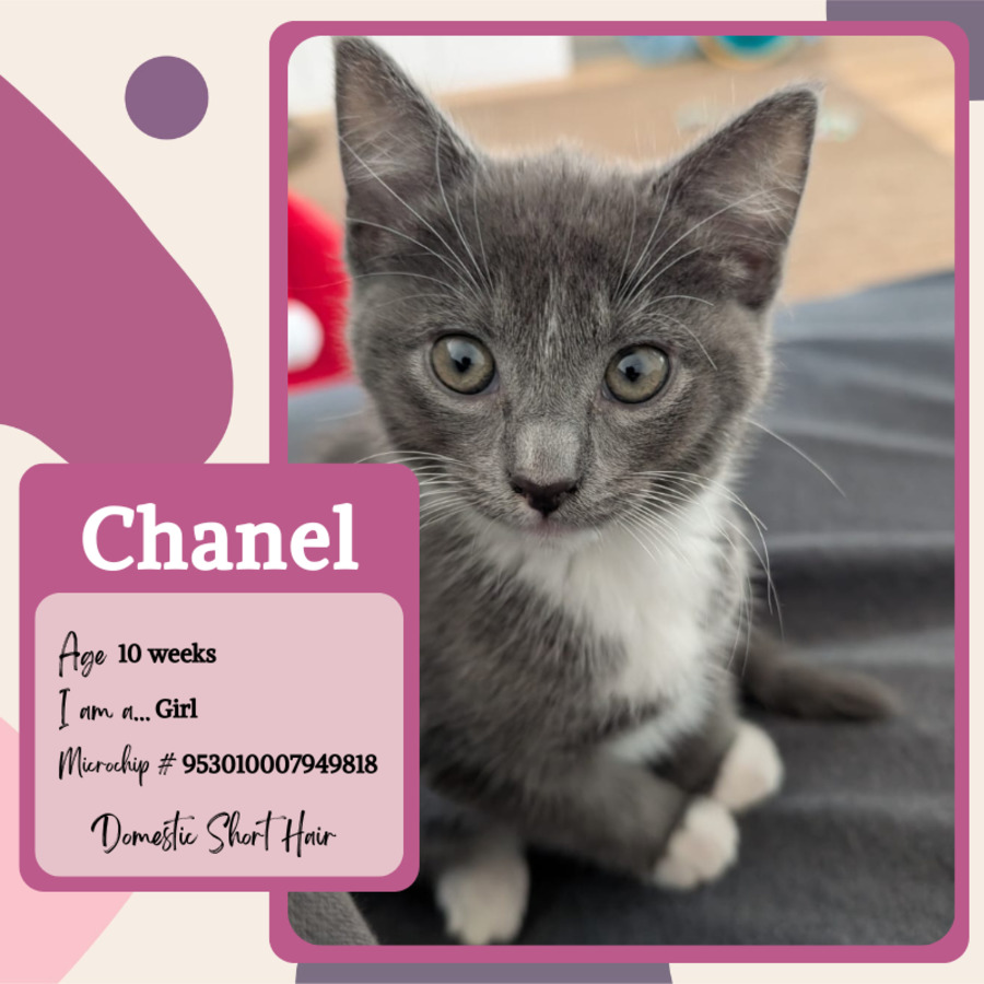 Chanel is a 10-week-old kitten with a calm sweetness and a poised, confident spirit. This lovely girl has a gentle way about her, observing the world with bright, curious eyes and taking everything in with quiet interest. She loves to sit nearby and watch whatever you’re doing, then strolls in for a cuddle.