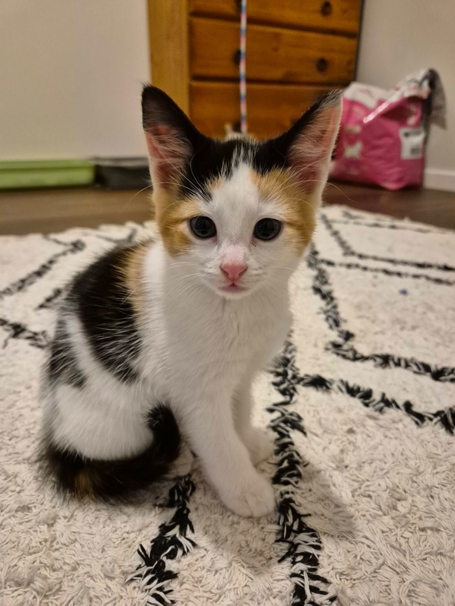 Meet Harriet, a charming young feline who brings a touch of calico beauty to any home she graces. Born on 17th October 2025, this domestic shorthair (DSH) is not only eye-catching with her unique coloring, but she also has an endearingly playful personality. It's hard not to smile at the sight of Harriet still growing into her paws and ears, adding to her charming character.