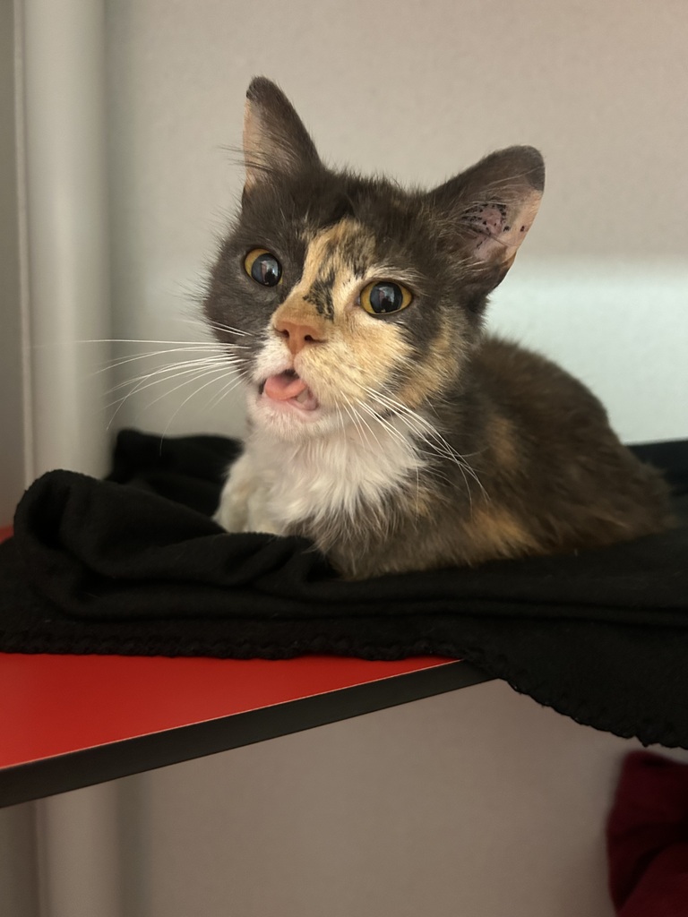 Jeenie has a unique charm - her upper and lower jaws don't quite line up, which means her tongue is always poking out. It doesn't hold her back one bit, and it only adds to her quirky, irresistible cuteness.