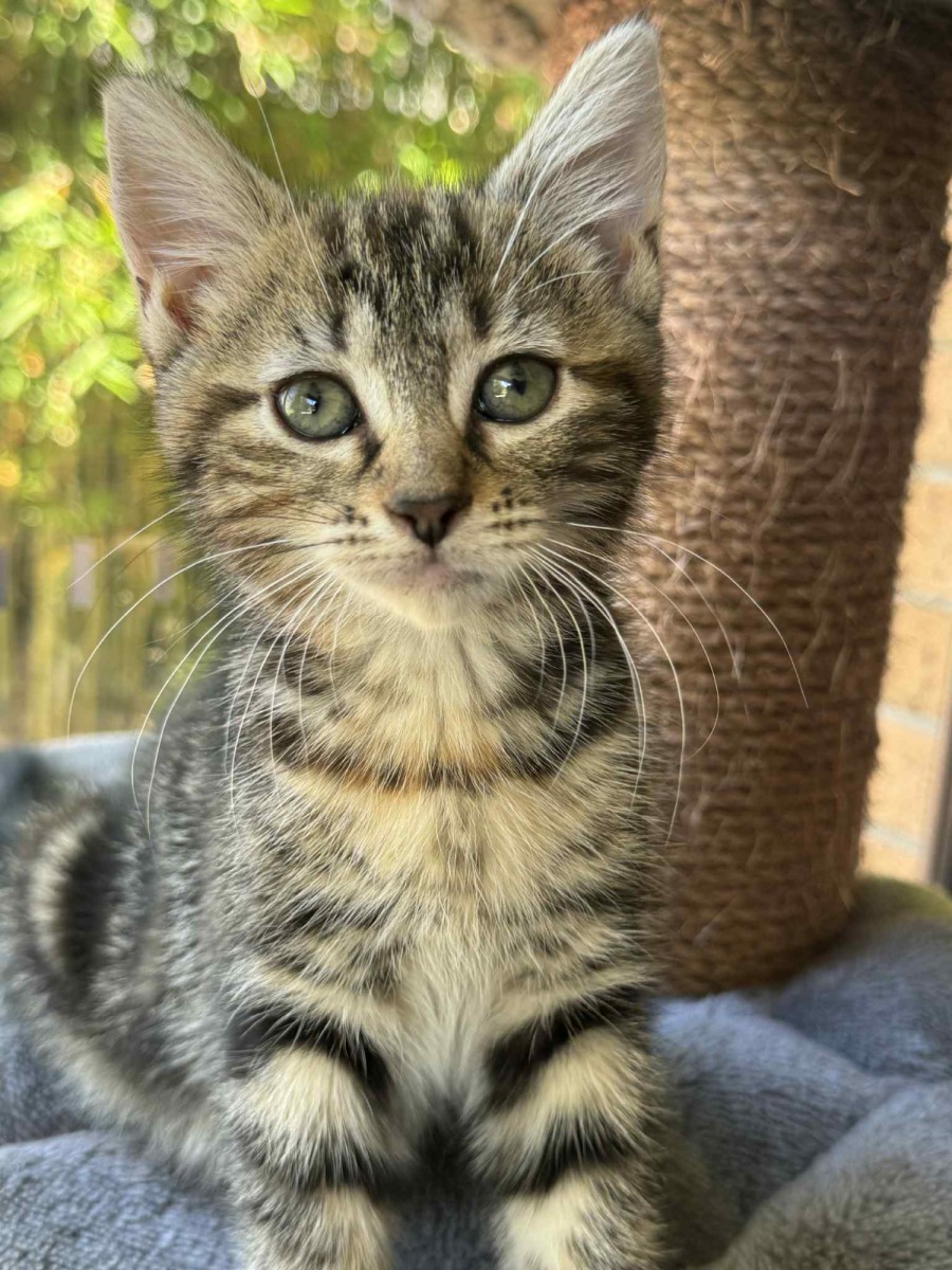 Daisy is exactly what her name promises. A beautiful little tabby flower, bright-eyed and full of joy, growing wherever there’s love, laughter and someone willing to be climbed like a very patient tree.