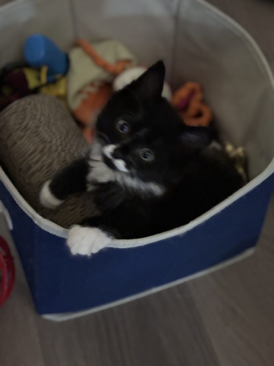 Harry is a sweet and confident kitten. He loves playing with his brother and crinkly cat toys. He also loves to try to catch his big foster brothers tail when it is being swished around. He will race around the house playing chase and wrestle with the toys and other cats.