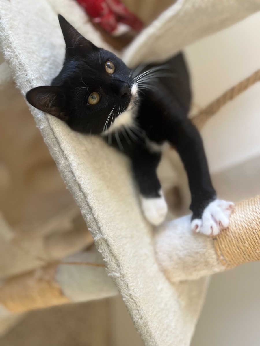 This 3-month-old black and white male kitten is looking for a loving family to call his own. He can be shy at first, but with patience and kindness he soon comes out of his shell. Once settled, he thrives on companionship and shows his sweet, gentle nature. He’s ready to grow into a loving, loyal member of his forever home.