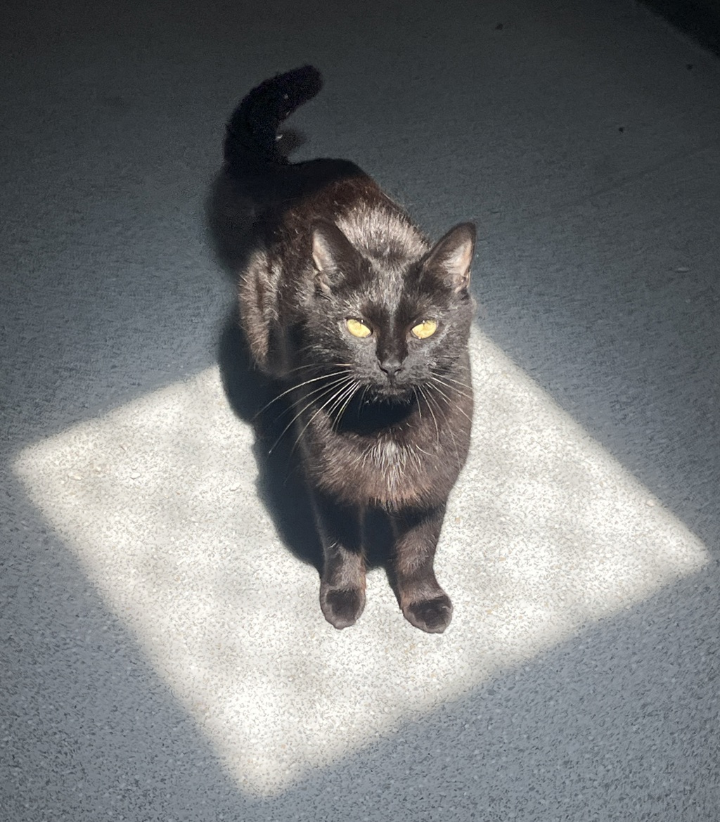 Sunny lives up to her name! This sweet black beauty spends her days following patches of sunshine around the house, soaking up every warm ray she can find. She's a gentle, curious girl with a calm presence and a playful spark that shines through when she's comfortable.