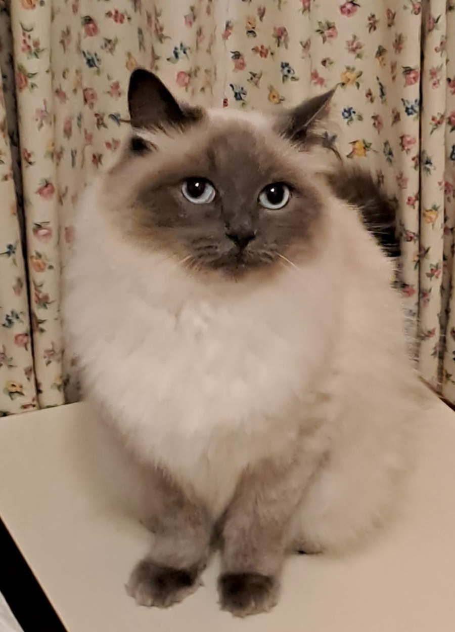 Misty is a purebred Bluepoint Ragdoll without papers. She has stunning blue eyes and a long silky coat. Misty is extremely affectionate and has a placid nature.
