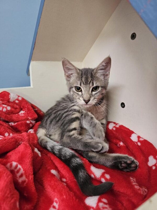 Hey there, I'm Jules. I’m a friendly and affectionate kitten who would suit most homes! My playful paws are always ready to pounce on anything that moves. I love playing with wand toys and mysterious shadows on the wall! When I’m finished playing, I love nothing more than finding a warm lap to curl up in. I have perfected the art of the irresistible purr. It's like my secret weapon for getting all the cuddles and chin scratches I could ever want. Life's just one big, exciting string of moments, and I'm here to make every second count – whether I'm chasing my tail or sharing some purr-fectly quiet time with my favourite humans. So, if you're up for a bundle of furry fun and a lifetime of companionship, please consider adopting me!
