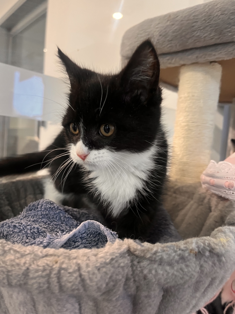 Since we're still young, our personalities are developing, and we'll thrive in a stable home. Please be patient with us as we adjust to our new environment. A safe room to get used to new sounds and smells would help, along with a scratching post, a comfy bed, soft toys, and rolling, bell toys (our favorites)!