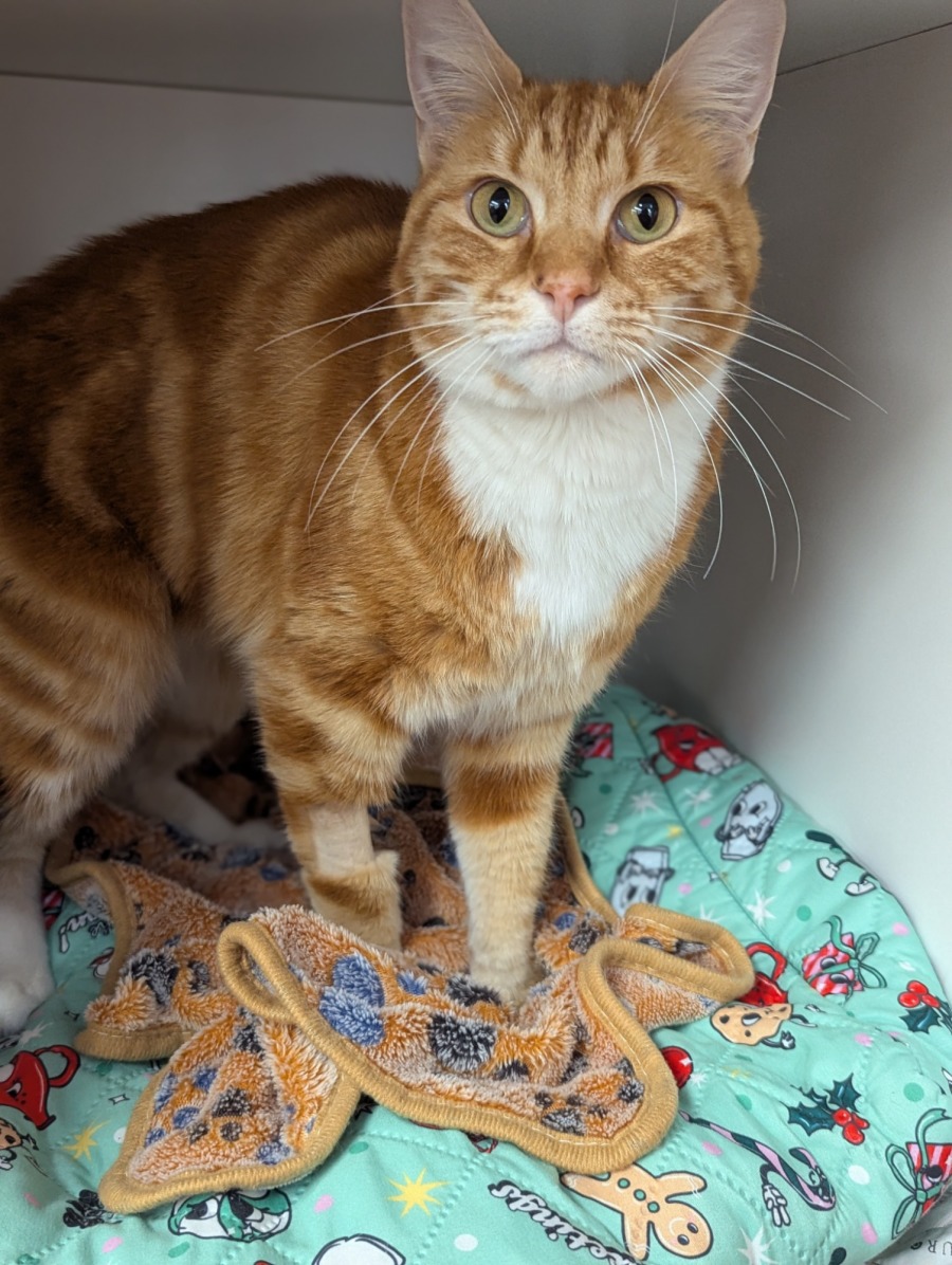 Pumpkin Bumpkin is a three year old ginger boy with a gentle soul who needs time and patience to feel safe in new environments. He is very shy at first and will likely spend his early days quietly observing while he learns that his new home is secure and predictable.