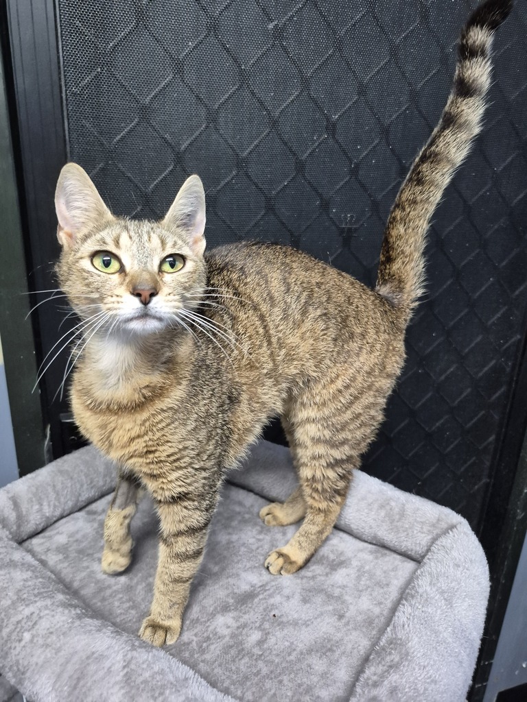 Mitzy is a beautiful brown tabby female with a heart full of affection. She loves spending quiet time with her people and will happily curl up beside you for company.