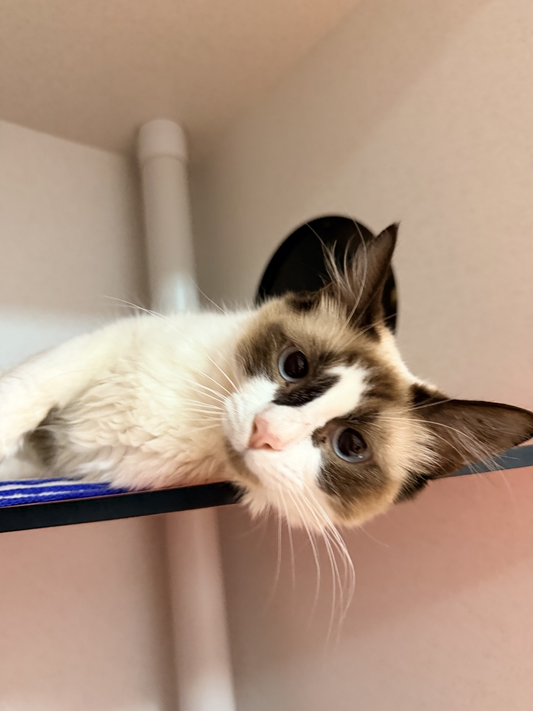 Cadbury would love a calm home where he can start out in a small, cozy room and gradually explore the rest of the house at his own pace. He thrives when he has plenty of safe spaces, like cat trees, scratch posts, cardboard boxes, igloos, and even shelves or dressers where he can relax high or low and watch the world go by.