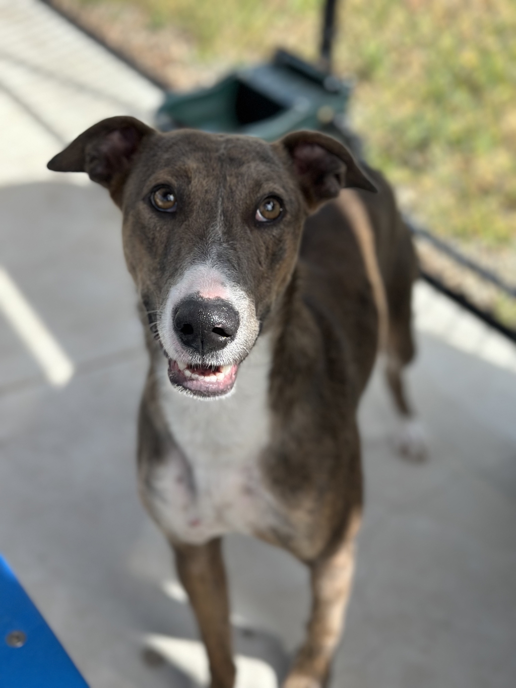 Delta is a sweet, gentle young Greyhound cross with a soft nature and a thoughtful approach to the world. She's still growing in confidence and blossoms when given kindness, reassurance, and time. Delta is very food-motivated and loves working for tasty treats, which makes training a fun and rewarding experience for both her and her adopter.