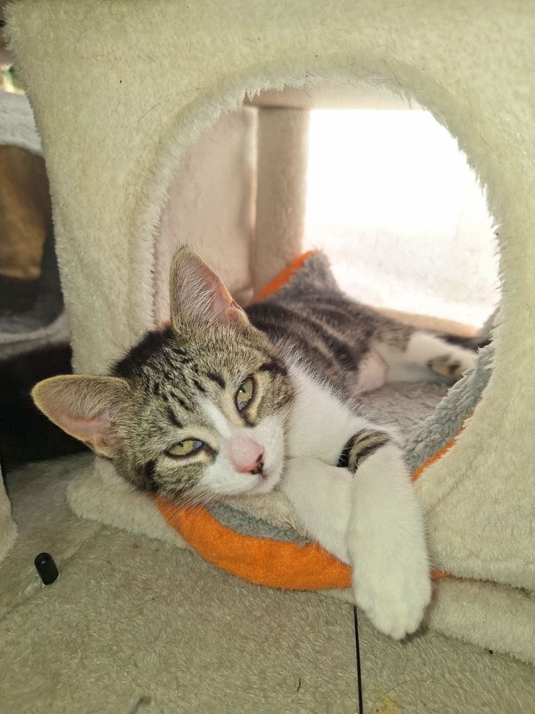 Lily is a beautiful little tabby-and-white princess who knows she deserves the royal treatment. Sweet, gentle and dainty, she carries herself like true kitten nobility — but don’t be fooled, she’s still a playful baby at heart.