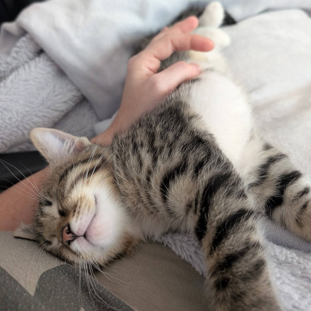 Claus is a sweet, friendly, and playful kitten who loves interactive play — especially chasing toys on a string and spinning in circles after his own tail. He's quiet and well-behaved, warming up quickly to new people. Claus enjoys being petted and will happily snuggle with you on the couch or in bed.