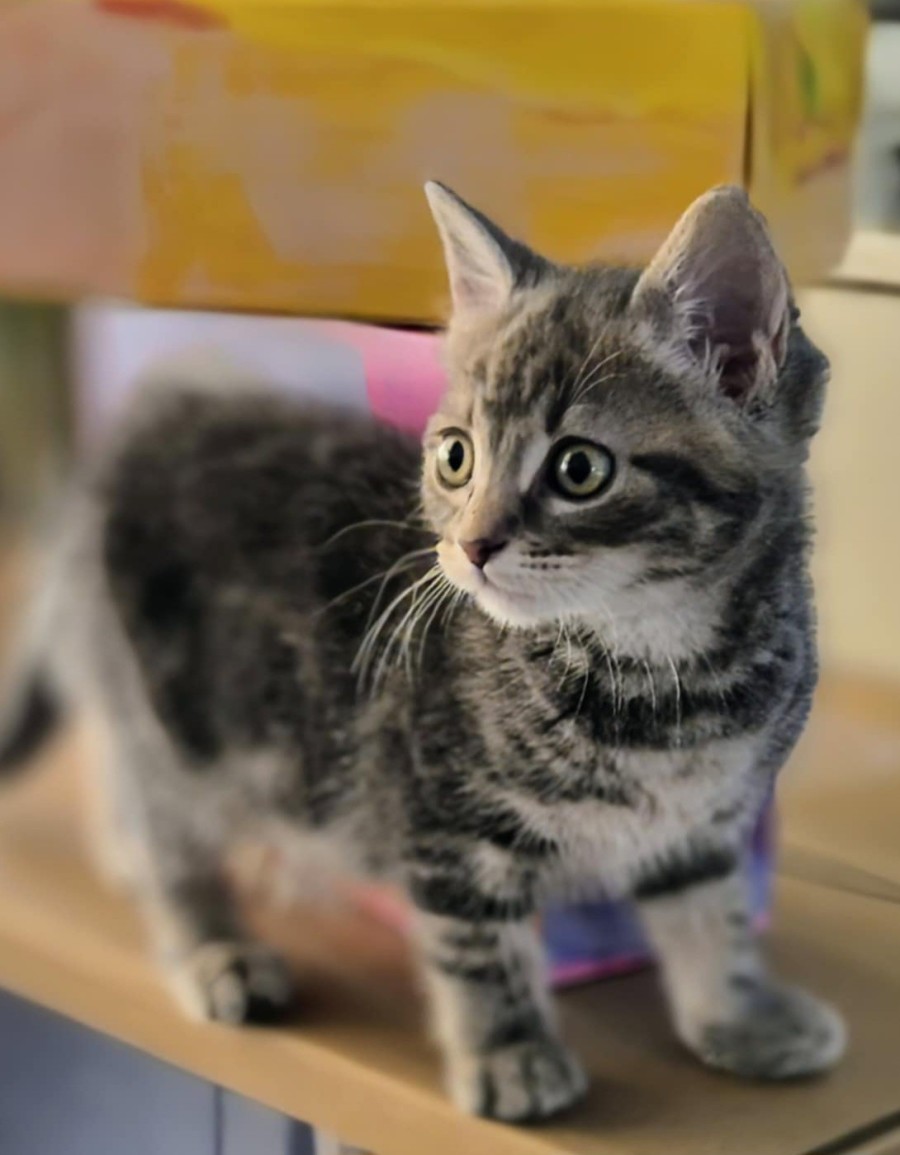 Meet Sage our playful kitten who’s loves playtime! This little one loves to explore, chase toys, and curl up for naps. Friendly, affectionate, and full of personality and her colouring is grey with caramel throughout. Very pretty!