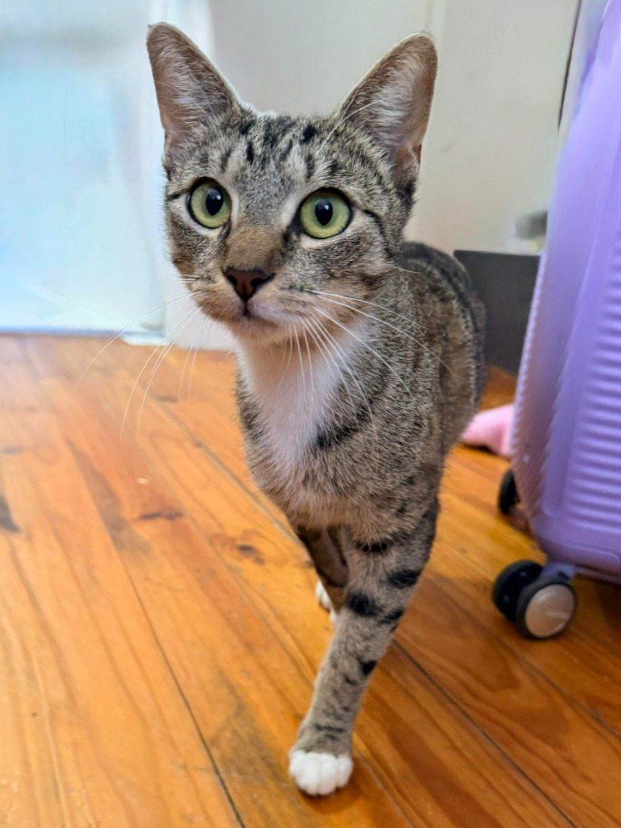 Baby is a truly beautiful little tabby with the most striking spotty coat and soft, soulful eyes that quietly draw you in. She has a naturally calm, gentle presence and carries herself with a lovely sense of grace. When you first meet her, Baby can be a little coy, preferring to observe her surroundings and the people around her before jumping in a thoughtful girl who likes to feel safe and settled.