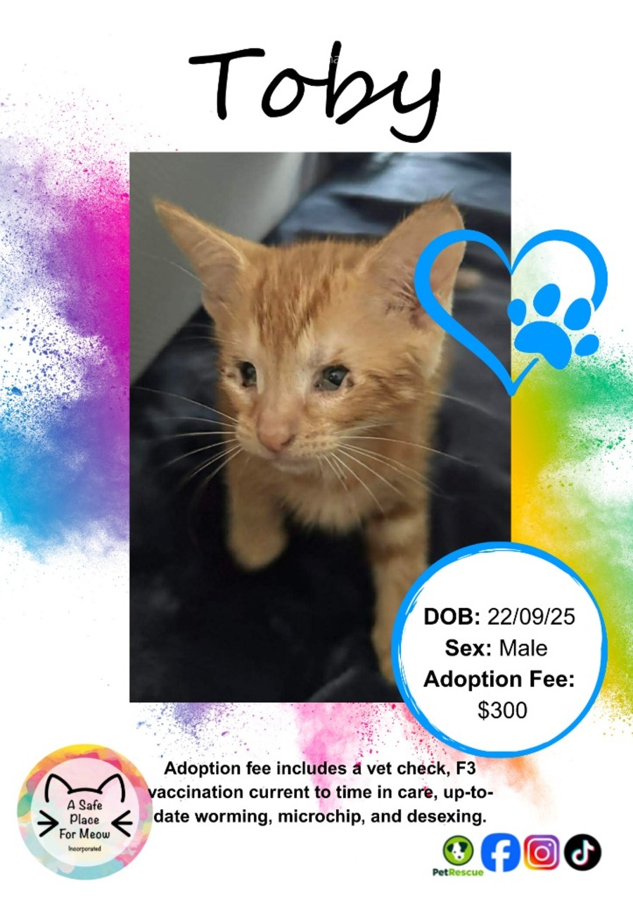 Toby is a gorgeous ginger boy, around 14 weeks old, with a sweet and gentle personality and a big love for people. He’s playful, curious, and enjoys cuddles just as much as exploring his surroundings. Toby is confident, affectionate, and enjoys being part of everyday life.