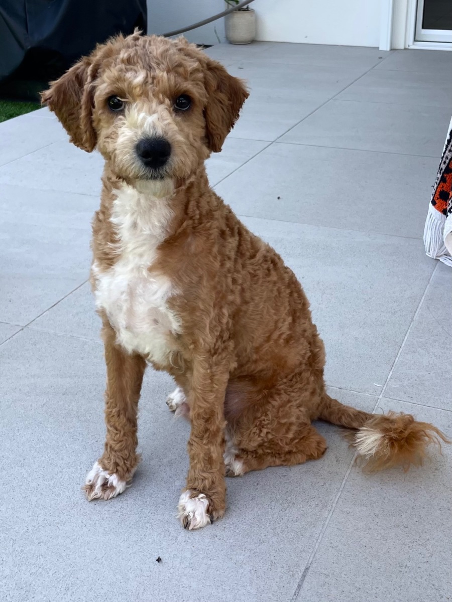 Alex is beautiful 5 months old Moodle who loves to play with his doggy friends and toys and when he is finished playing loves to chill out on the lounge cuddled up next to you .