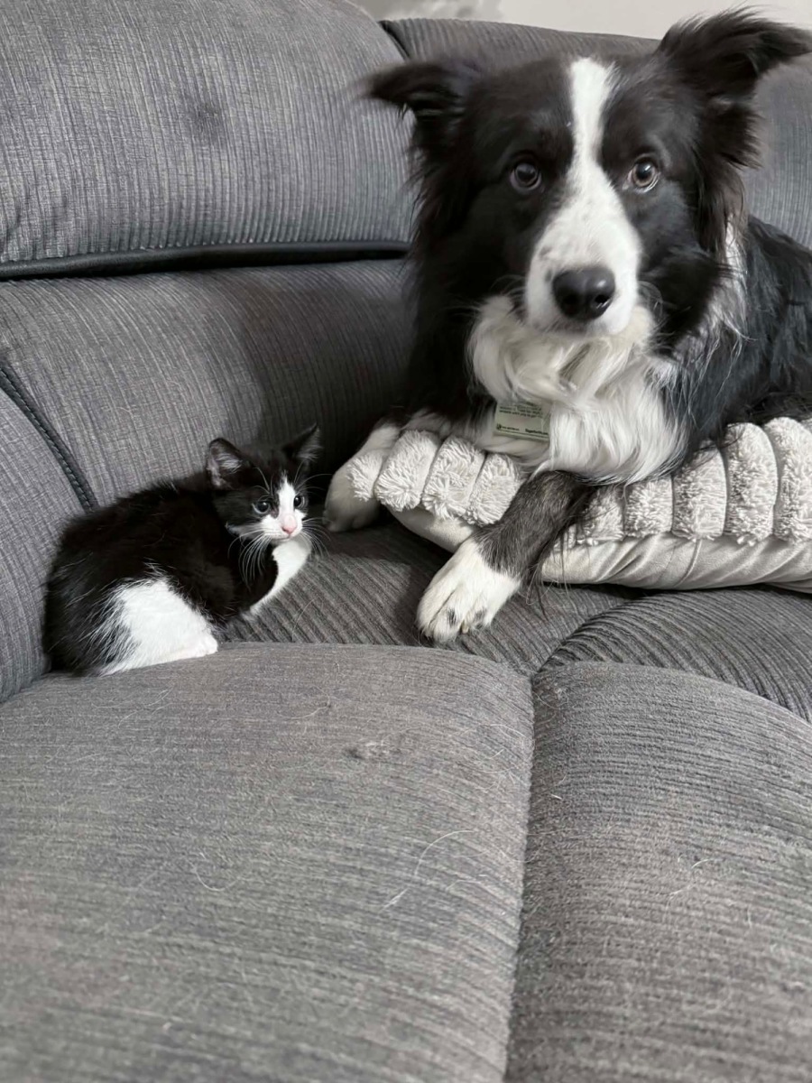 Meet Oakley, a delightful little tuxedo girl bursting with energy and charm. With her distinctive black-and-white coat and playful nature, Oakley is a captivating presence who adds joy to any household.