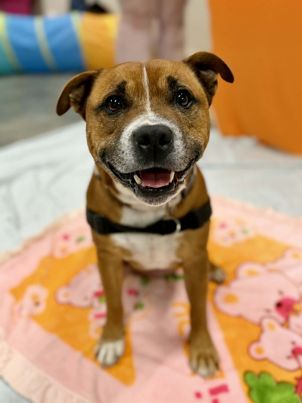 Rosie enjoys being indoors with her people and will happily travel along for car rides. Outside time may need supervision, as she can be curious about wildlife. She can get excited at times and may jump up, so a home with older, steady children would be ideal - though families familiar with Staffy personalities may be a good match too.