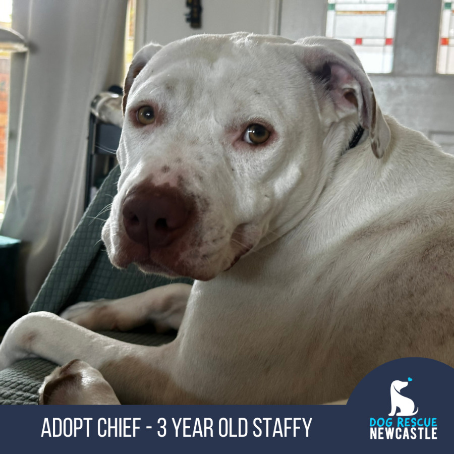 Chief is in foster care in Elermore Vale, NSW, and is not available for adoption interstate. His adoption fee is $600, and he is desexed, microchipped, vaccinated, treated for fleas, ticks and worms.