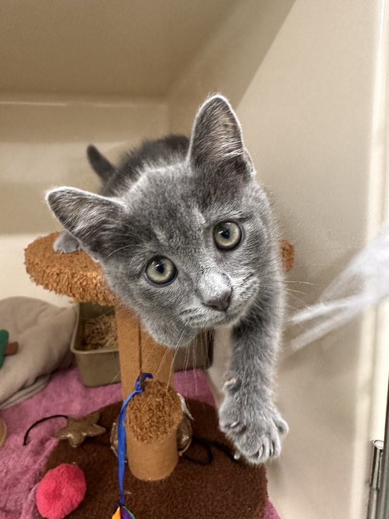 Moon will thrive in a home that provides plenty of enrichment and safe spaces, including scratch posts, cat trees, cardboard boxes or igloos, and access to shelves or dressers so he can choose both high and low resting spots.