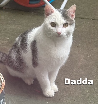 Dada Scott is a handsome white and grey boy with striking amber eyes who is ready to leave his stray days behind and settle into a safe, loving home. He was found as a local stray, likely being fed by multiple unit complexes, and is thought to have fathered at least two litters before coming into care. Despite a rough start, Dada Scott has shown himself to be a gentle, affectionate cat who truly enjoys human company once he feels secure.