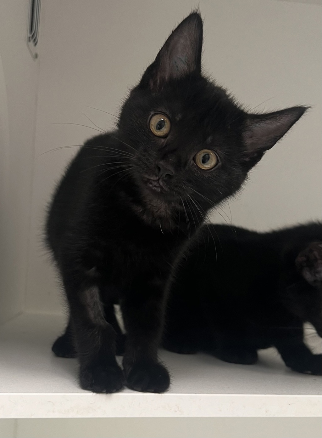 This little black kitten is a quiet observer with a gentle soul. At just three months old, she is the shy one of her all black litter of three, happiest when things are calm and predictable. She enjoys watching the world from a cosy hideaway and will peek out for soft voices and slow movements. With time and patience, she is starting to show her curious side, especially at mealtimes.