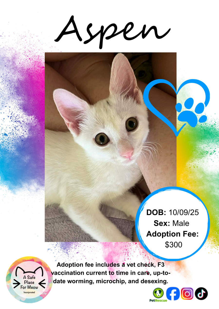 Aspen is a sweet, gentle cat who loves being close to people. They enjoy quiet company, warm naps, and curling up beside you when it’s time to relax.