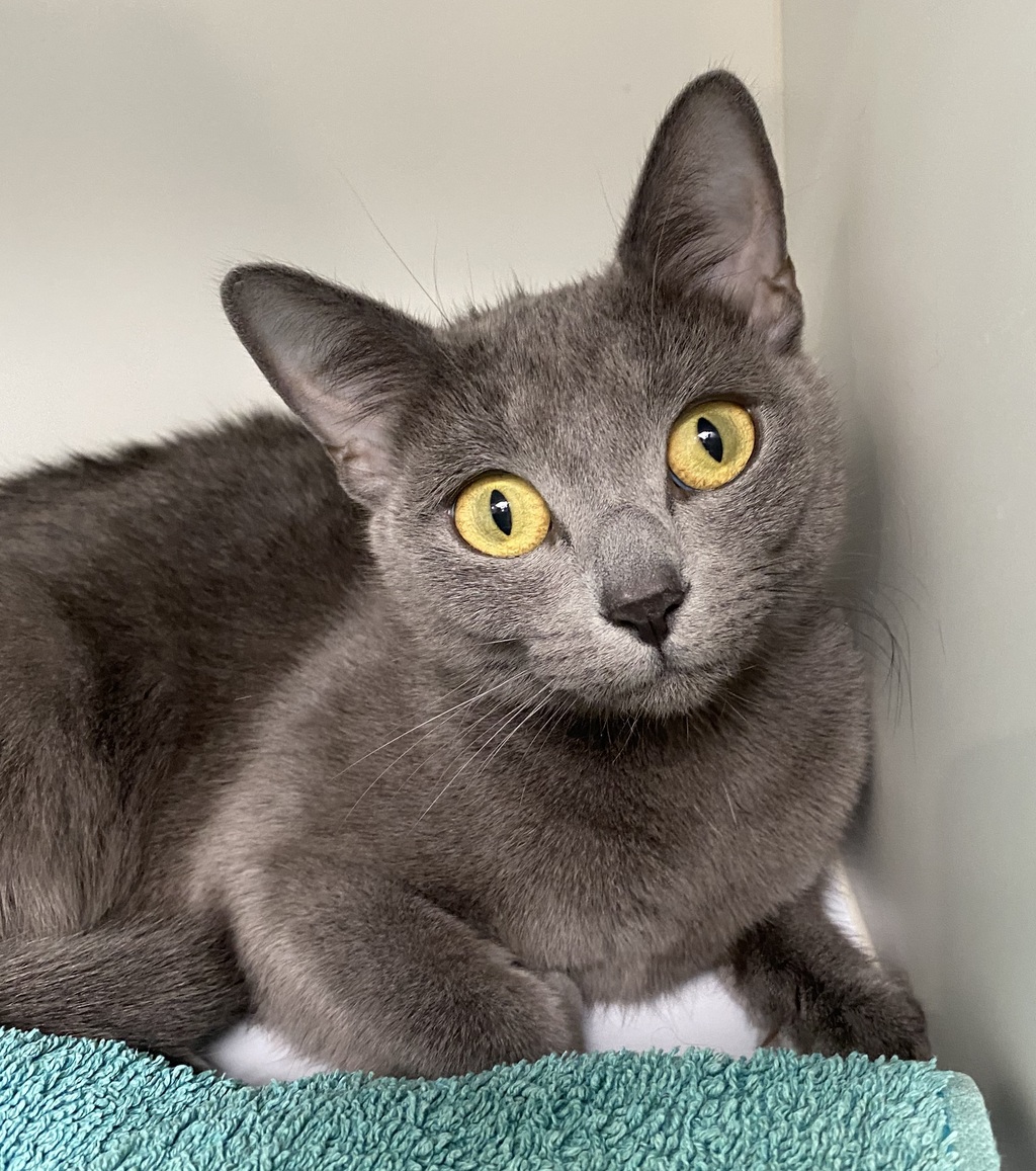 Duchess is a young, elegant girl whose name suits her perfectly. With her stunning blue coat and graceful demeanor, she's a true little lady. While she can be curious and a touch reserved at first, Duchess blossoms into a deeply affectionate and loving companion once she feels safe.