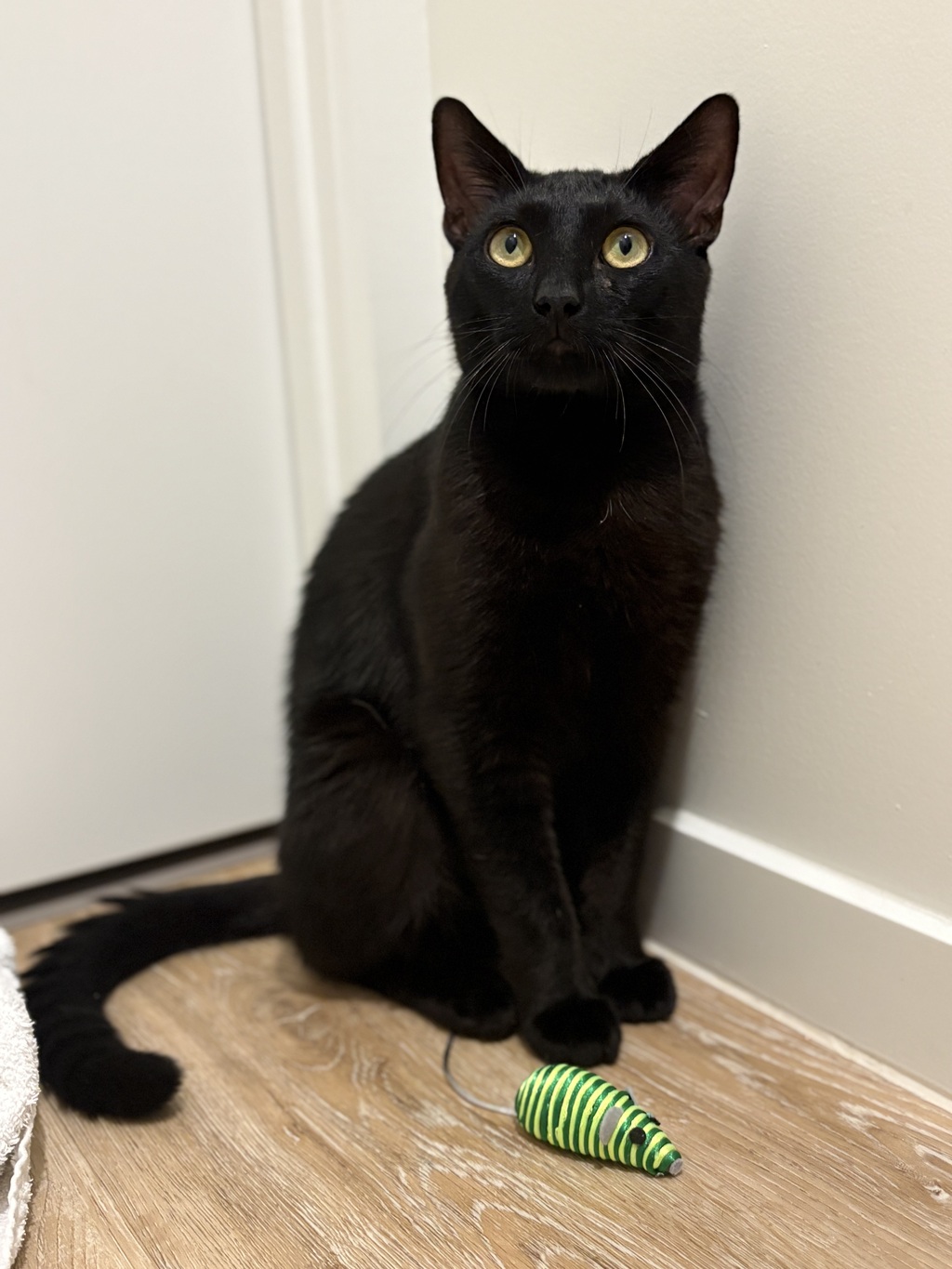 Meet Hank! Hank is a striking black boy with a big quirky personality. He's looking for an experienced and patient adopter who understands that trust takes time and is willing to let Hank set the pace. It seems Hank has not had a loving family before arriving here so is still learning that pats can be comfortable. He is cat social and enjoys the company of other cats so will need a confident social feline buddy for companionship and will make a great feline friend for your cat! Hank's love language is food - especially chicken which can be a great way to build positive associations and connection with him. Though he may be a challenge at first, he sure has the potential to be an incredibly rewarding companion for someone who appreciates his individuality and is committed to helping him continue to grow.
