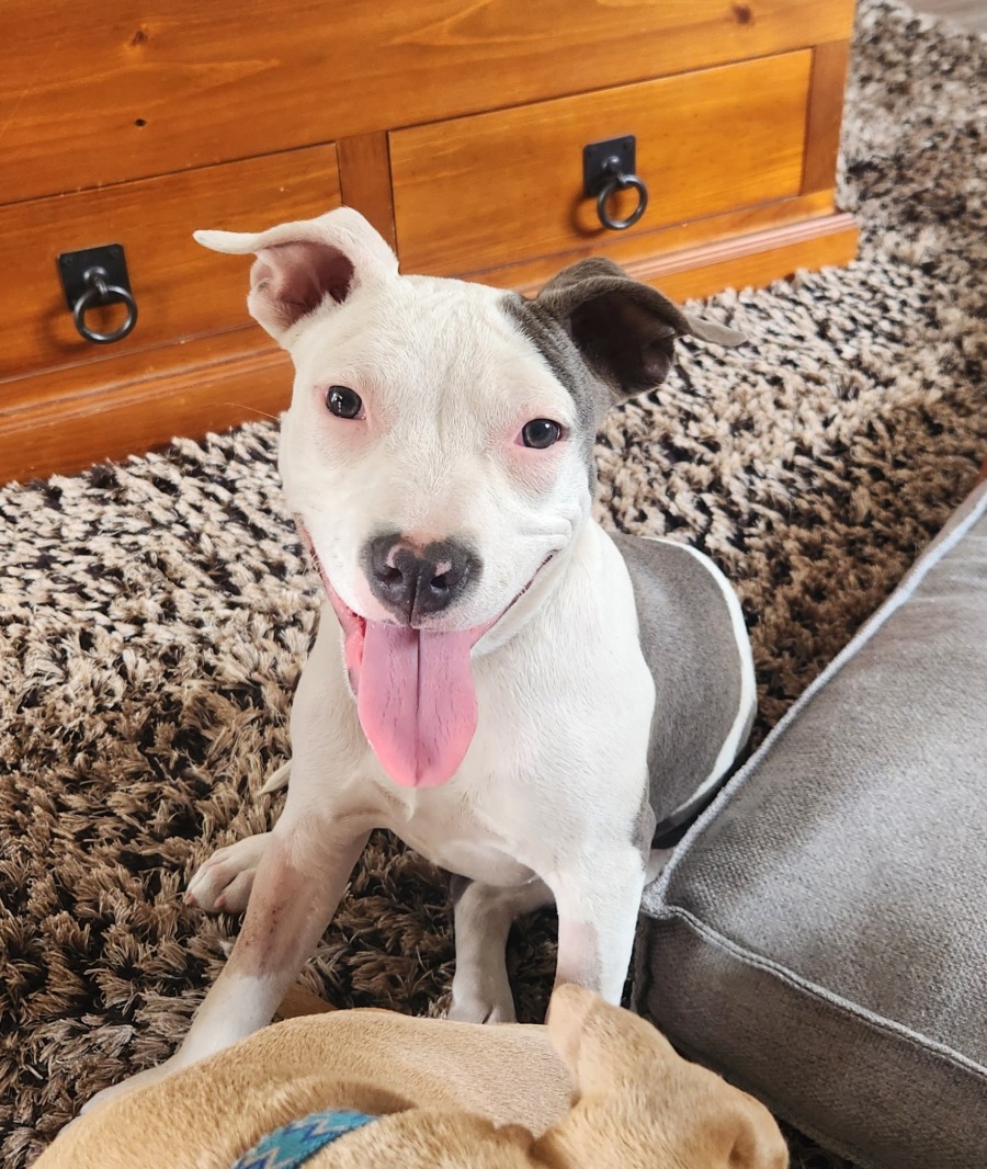 Solar is a sweet and smart young staffy mix looking for a family and home to call her own. She was originally found walking around on her own as a stray and no one came in to take her home. She has since spent time in the shelter, then foster care where she has worked on her basic trainings including crate training, house training and the start of her trick training. All of this will need to continue and be fine tuned in her forever home. Solar has shown to be social with both dogs and people and may suit a home with a well established and trained dog to help guide her. She may also suit a home with children who don't mind a playful staffy chewing on their shoelaces! Solar has not met a cat in foster and we do not know how she will go with cats. She is an eager young pup who has an awesome personality, she just needs the right home to let it shine. She is looking for a home that will commit to the training she will need through puppy school or obedience classes. If you think you have the means and the times to commit to a puppy, please apply.